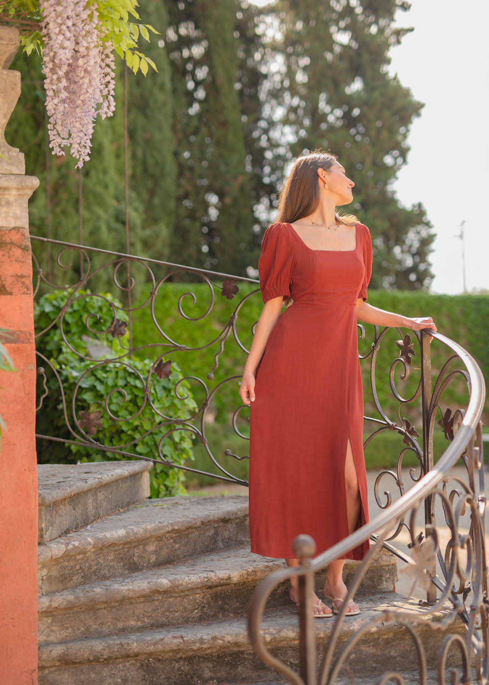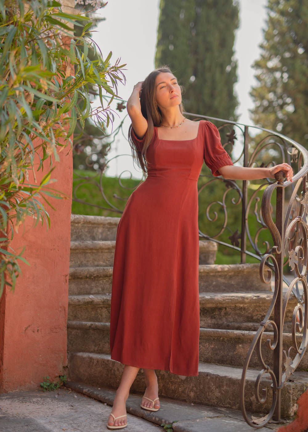 Realizzato in una tonalità calda e avvolgente, questo abito unisce romanticismo e femminilità con naturalezza