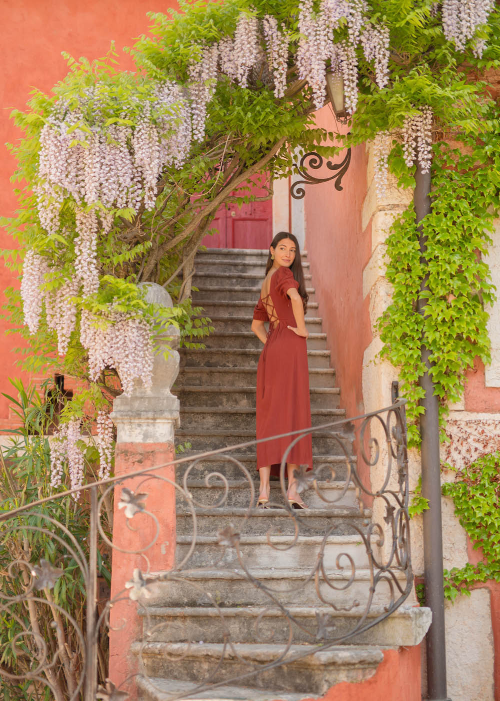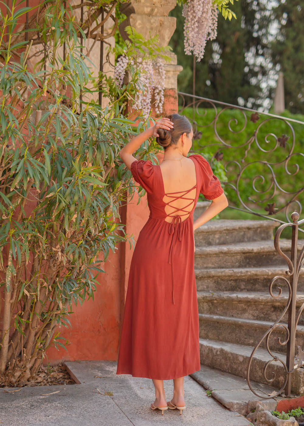 Il vero dettaglio protagonista è il retro: una scollatura aperta con intreccio regolabile che disegna la schiena con grazia, rendendo l’abito ancora più speciale