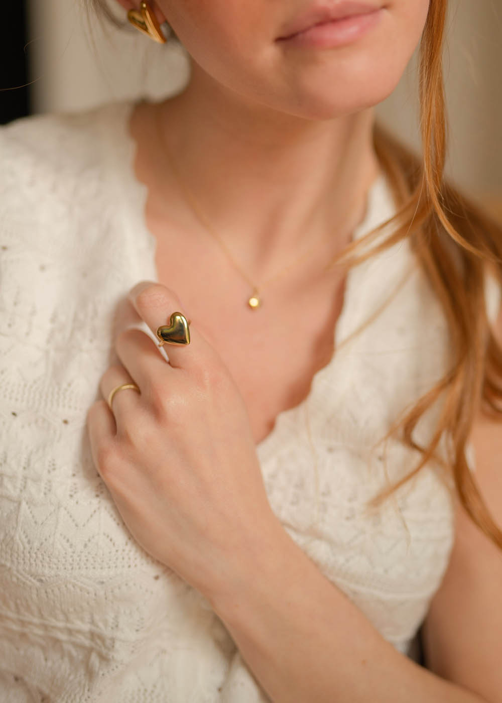 L’anello Cuore Lucido è un gioiello essenziale e luminoso, caratterizzato da un cuore bombato dalla finitura specchiata che cattura e riflette la luce con eleganza