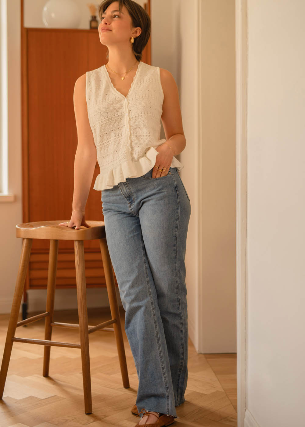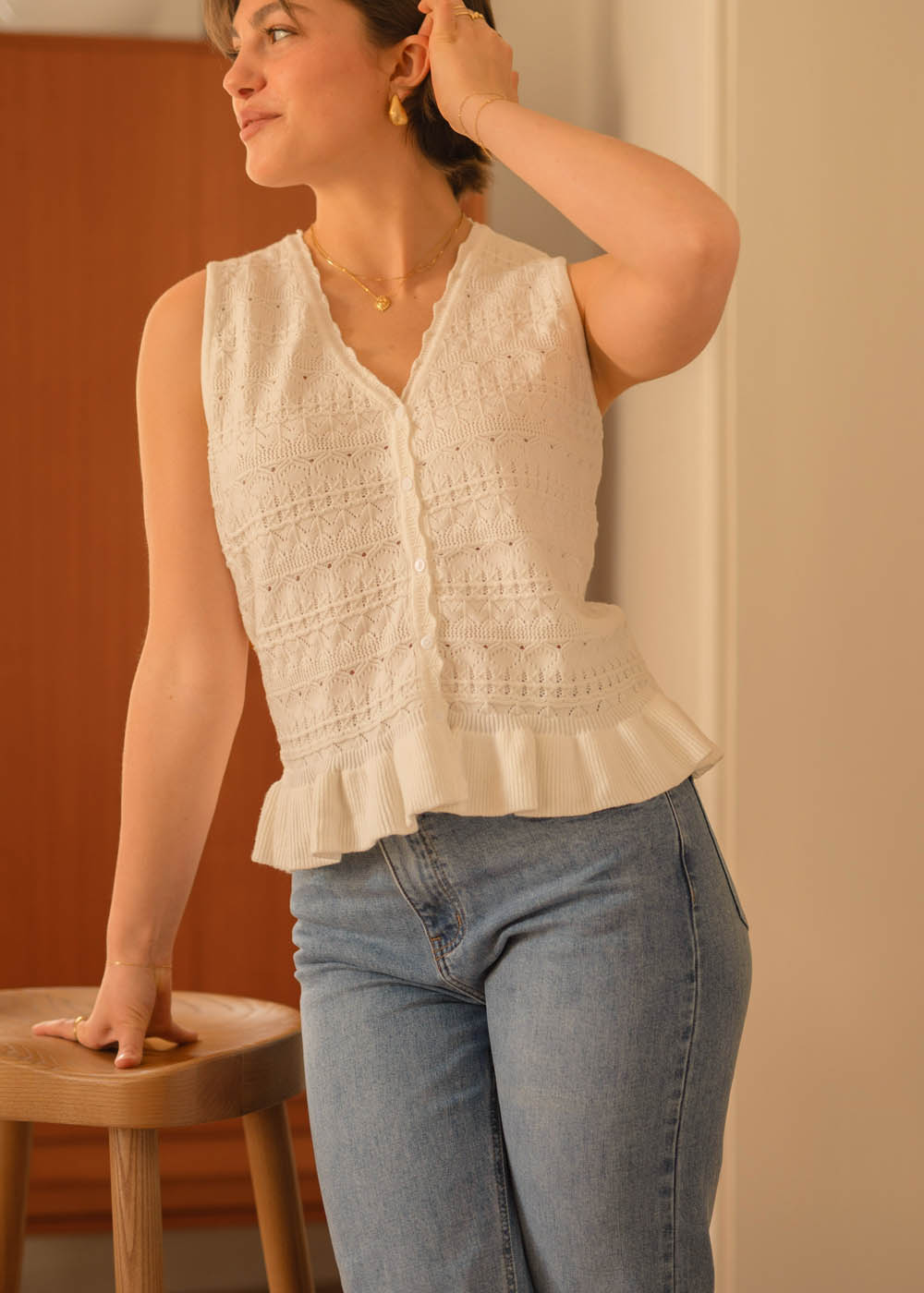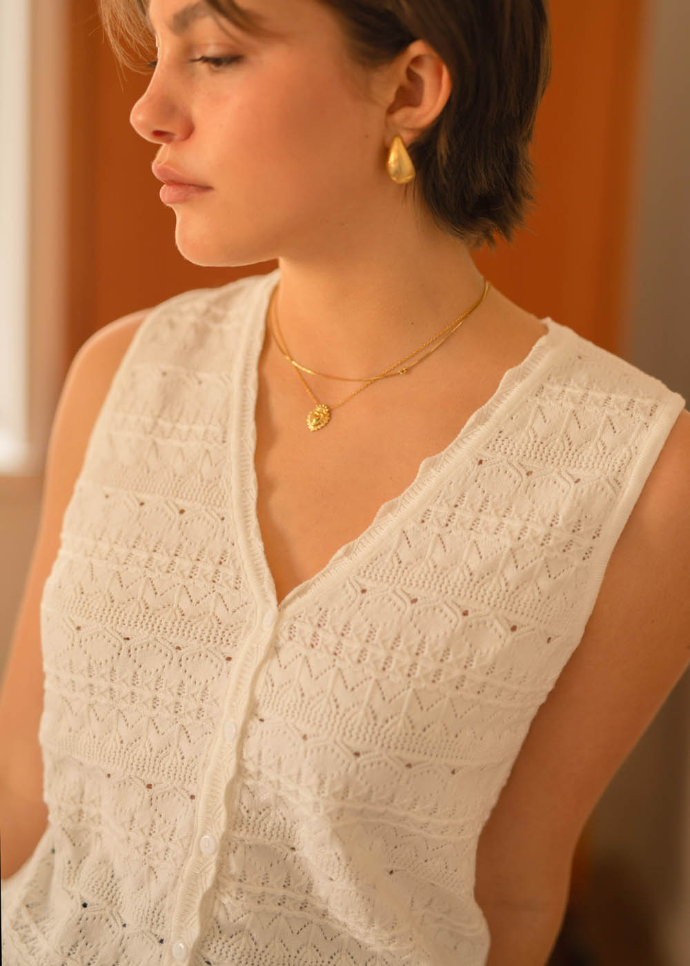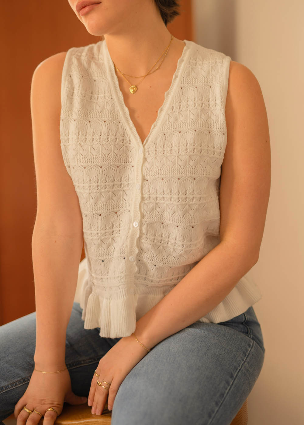 • Top smanicato lavorato, dal fascino delicato e senza tempo