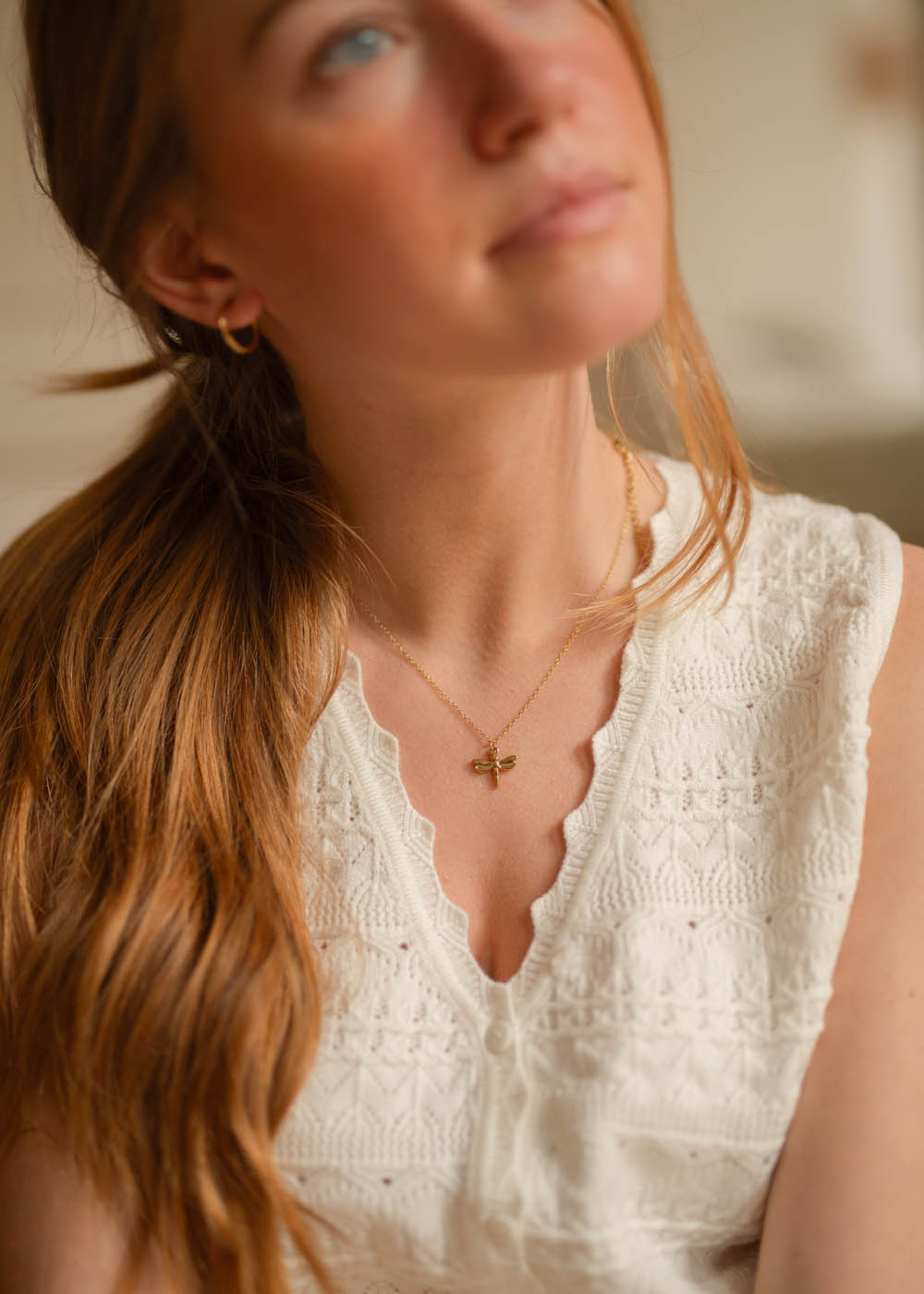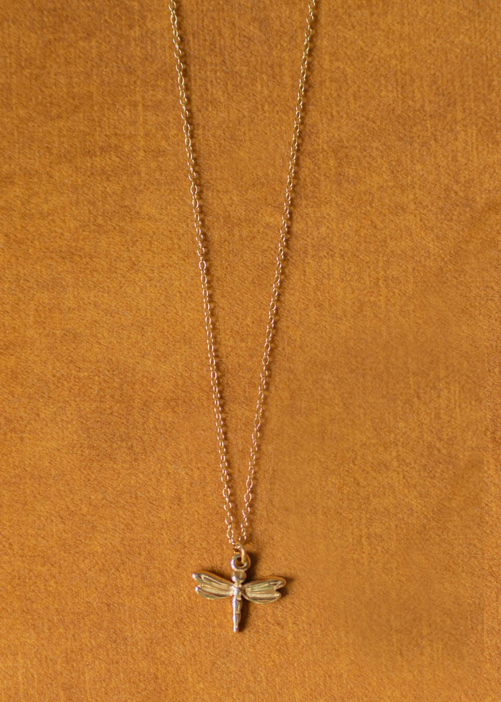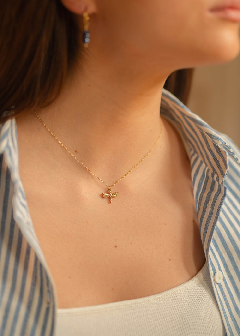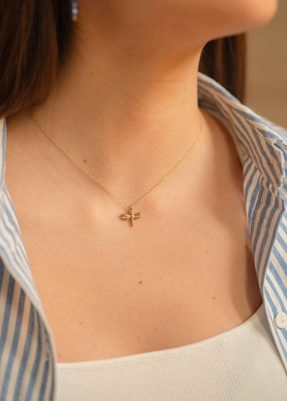 • La sottile catena dorata accoglie un piccolo pendente a forma di libellula, elegante e luminoso.