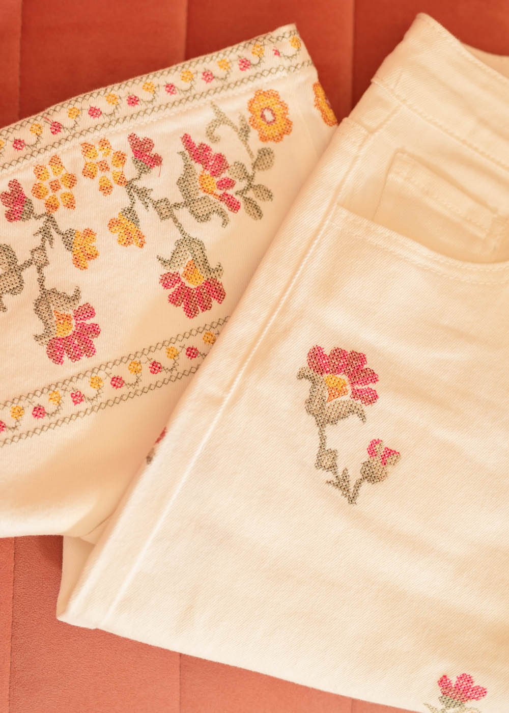 • Jeans chiaro ricamato a punto croce con dettagli floreali