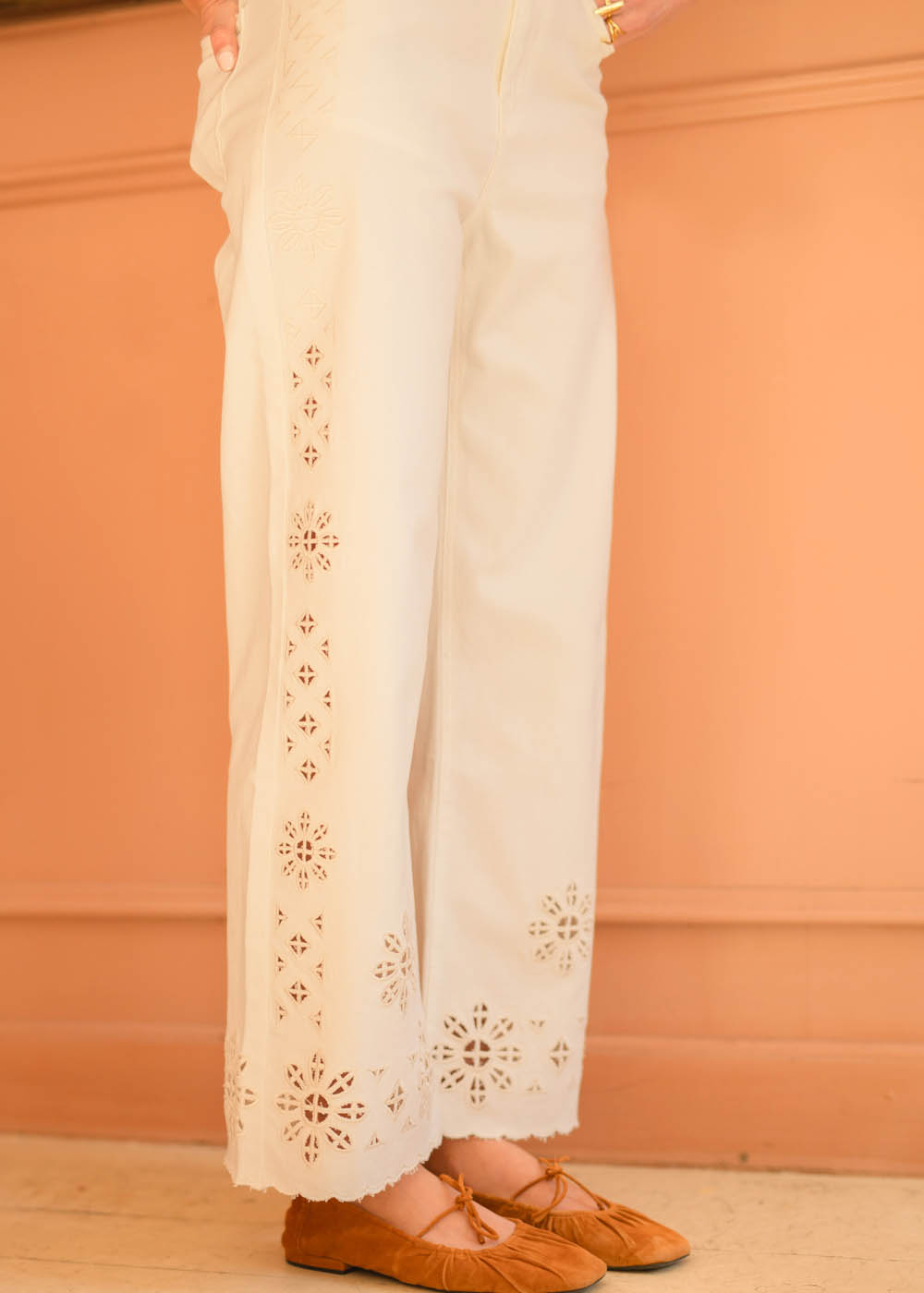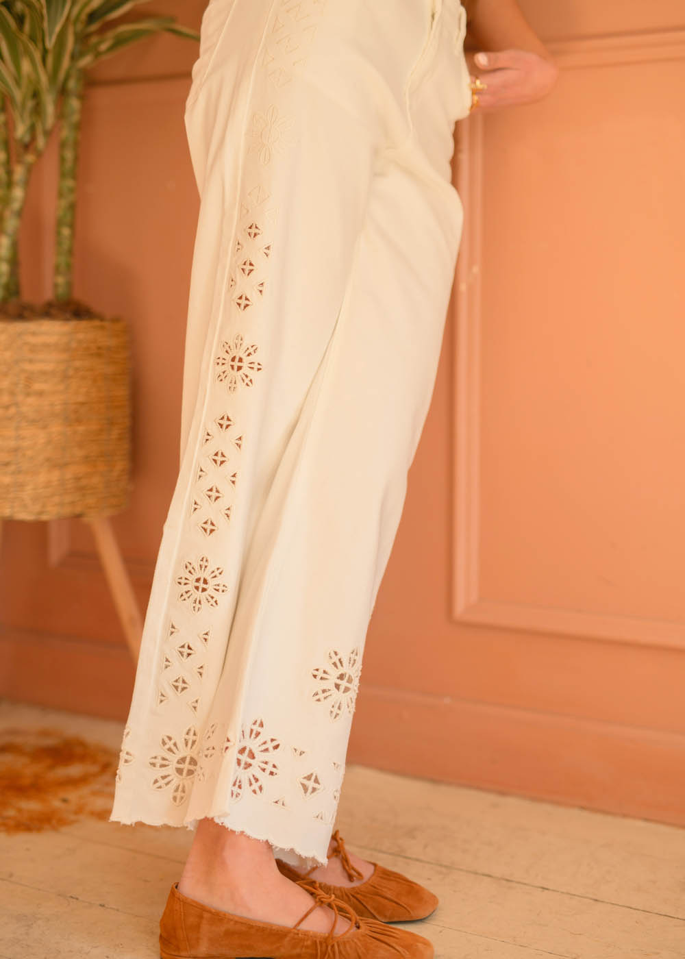 - Motivi floreali e geometrici tono su tono creano un disegno armonico lungo tutto il fianco della gamba
