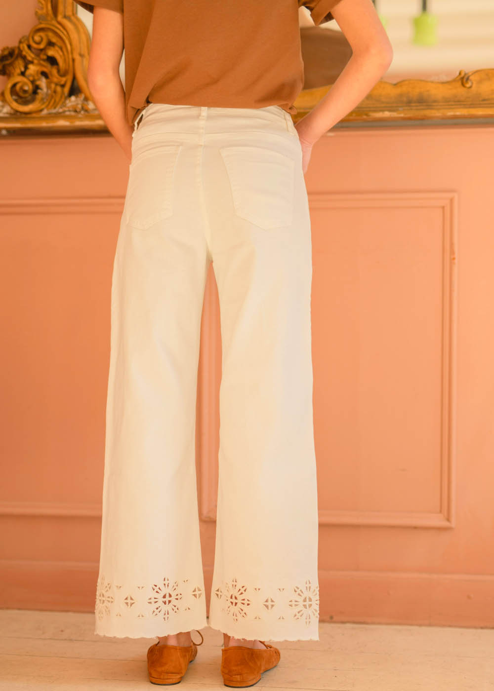 - Jeans in denim bianco con dettagli cut-out sulla gamba