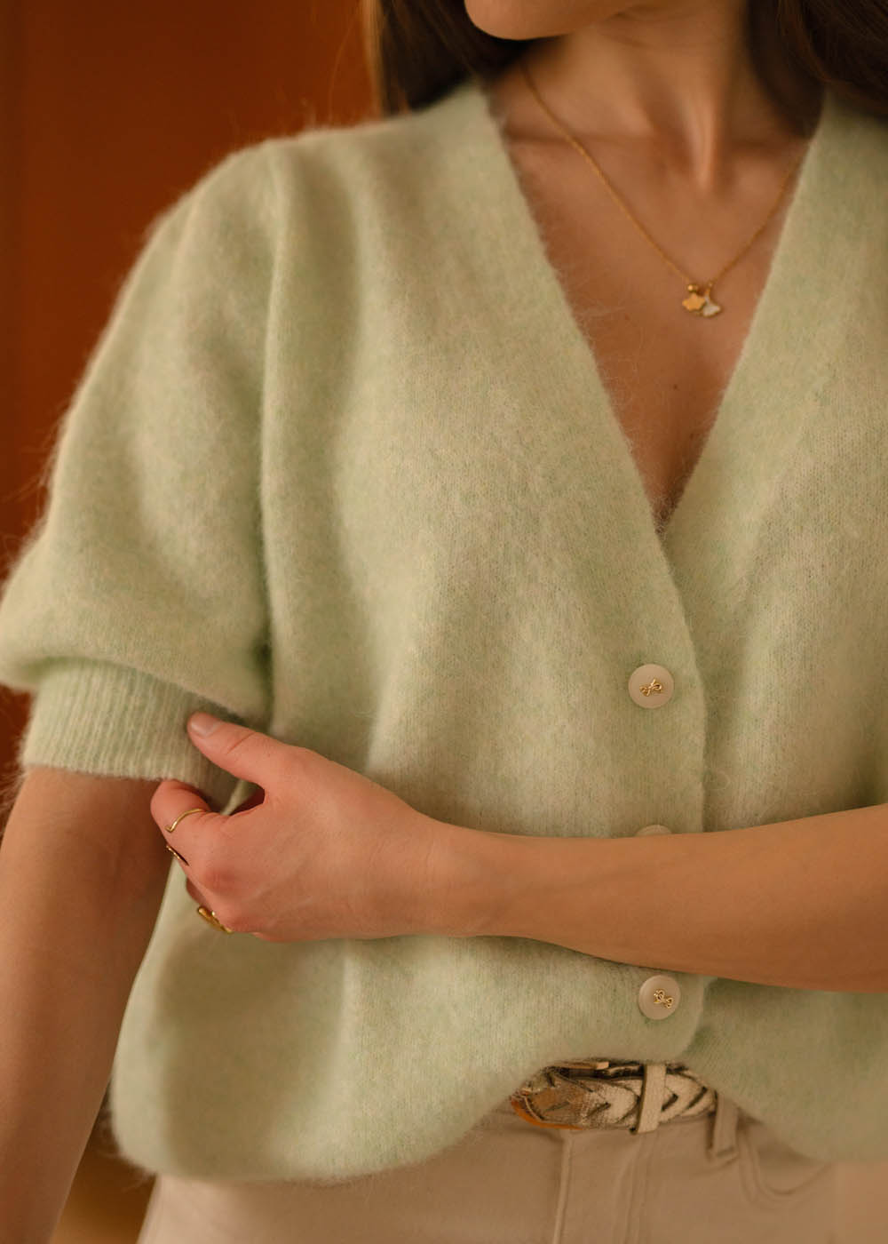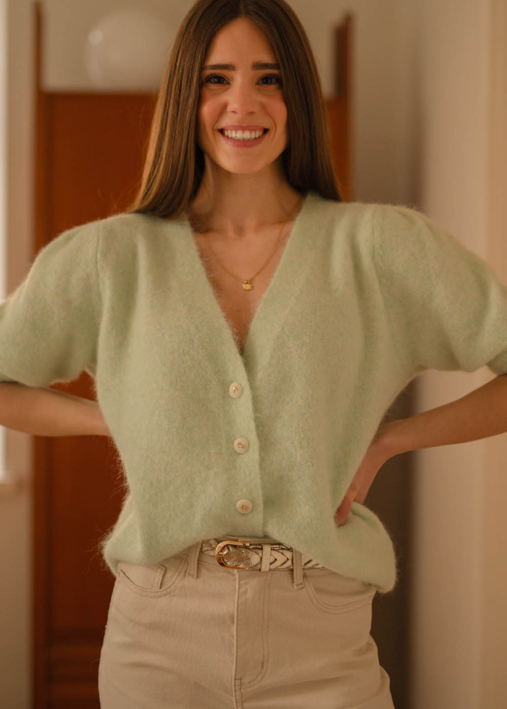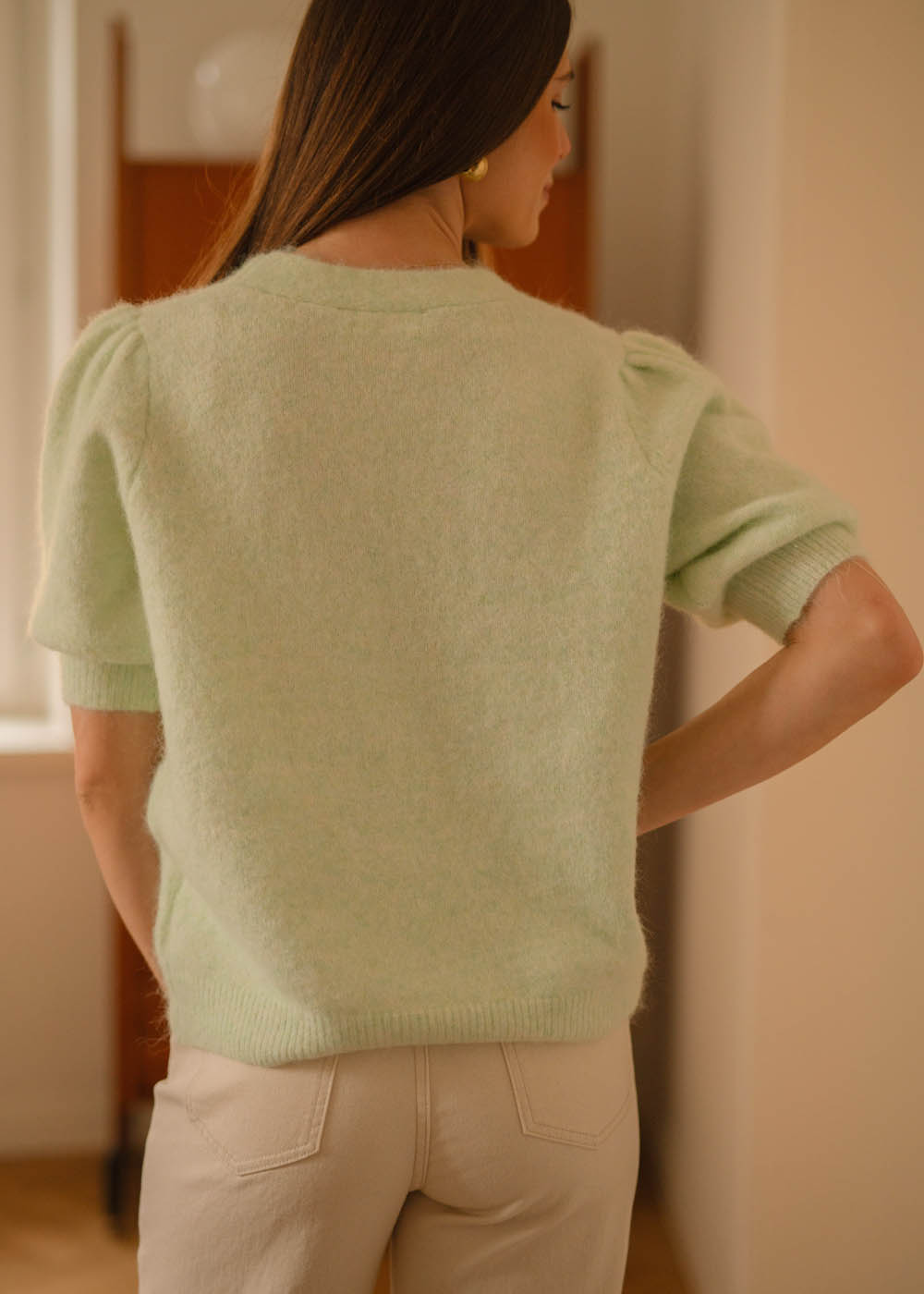 Questo colore menta è pazzesco. Lo indosso con i pantaloni che abbinano in descrizione ed è un look bellissimo.