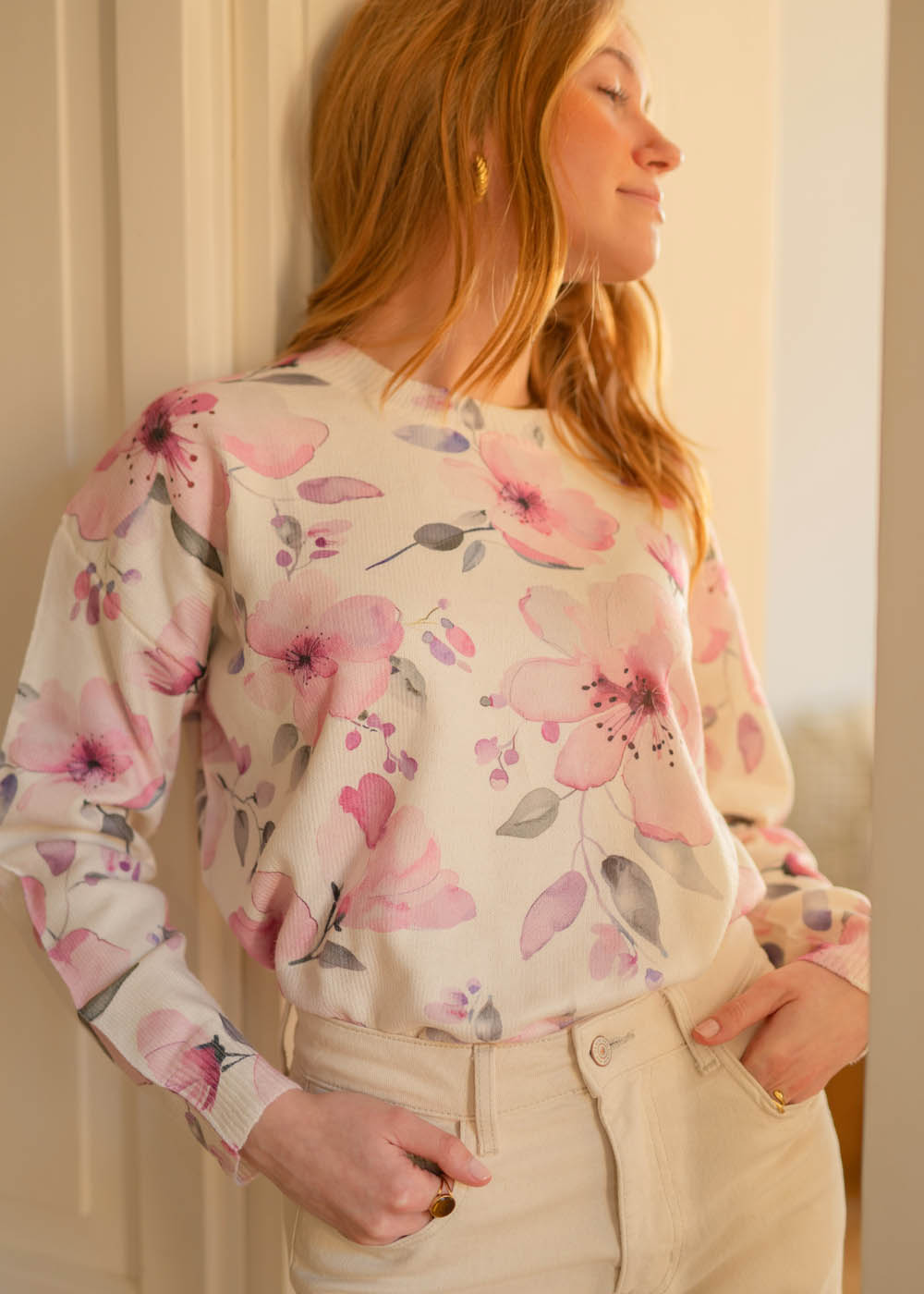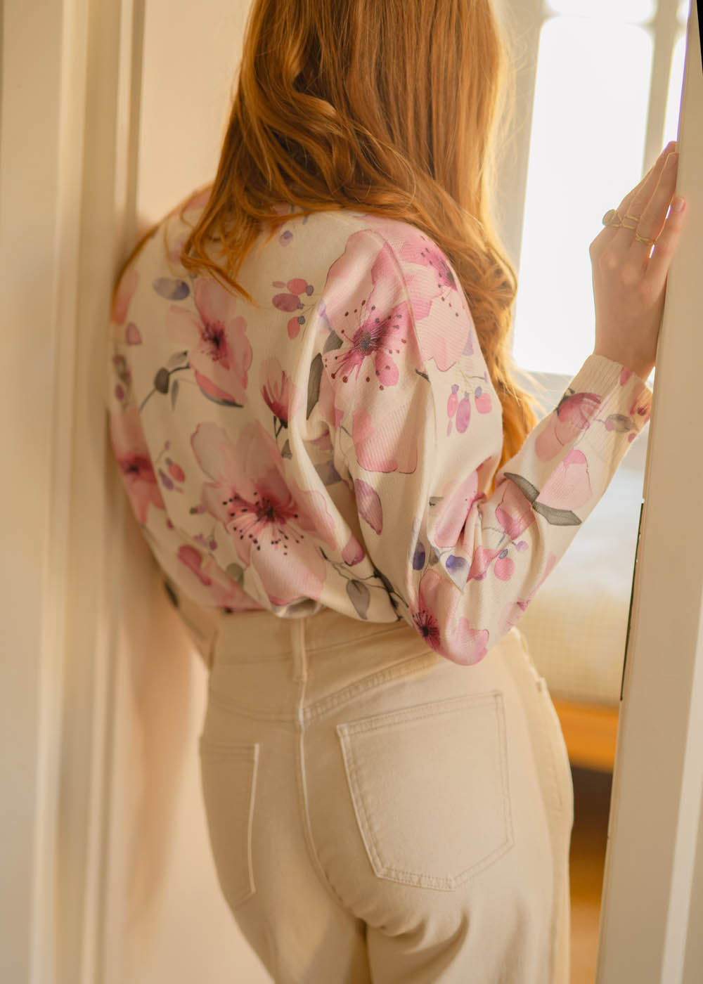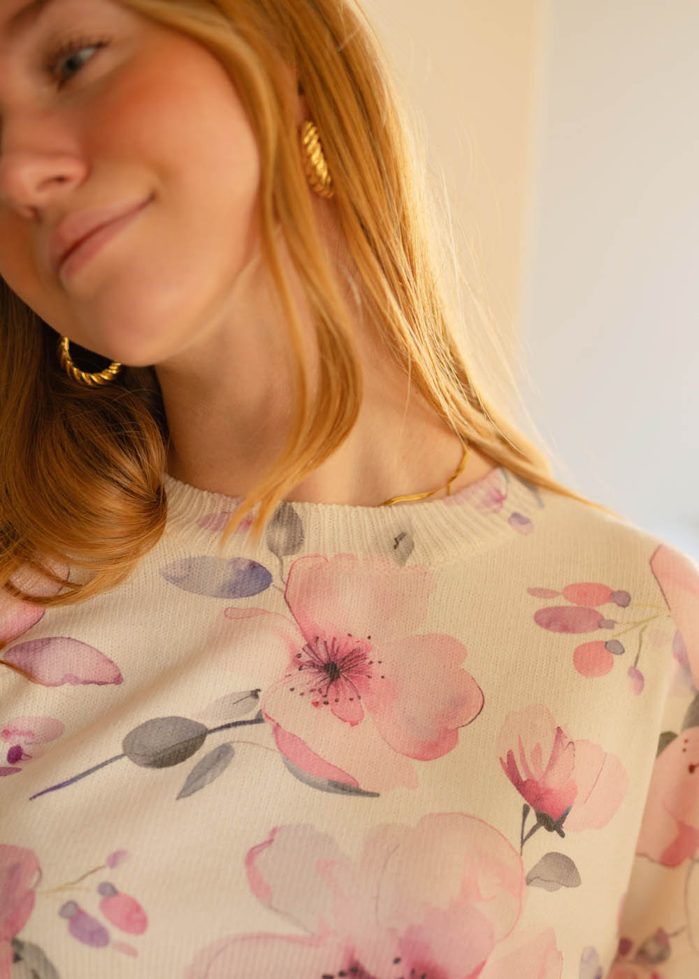 Un maglioncino morbido, romantico e decisamente primaverile per la sua fantasia floreale. Adorabile! Grazie Amelia!