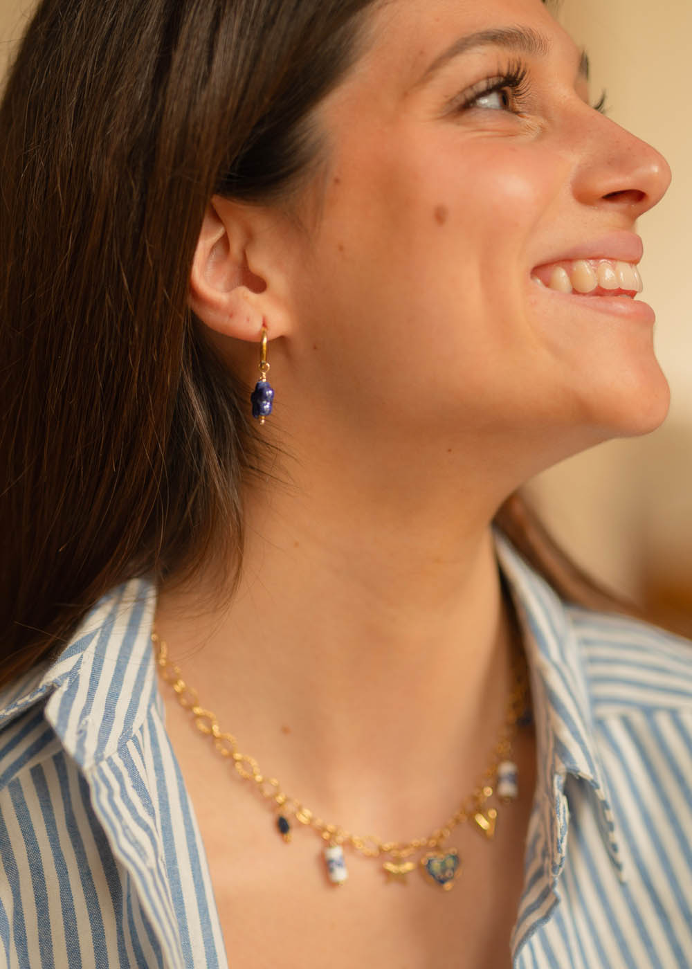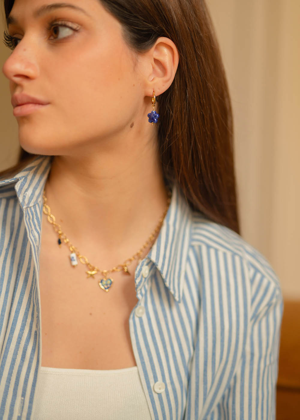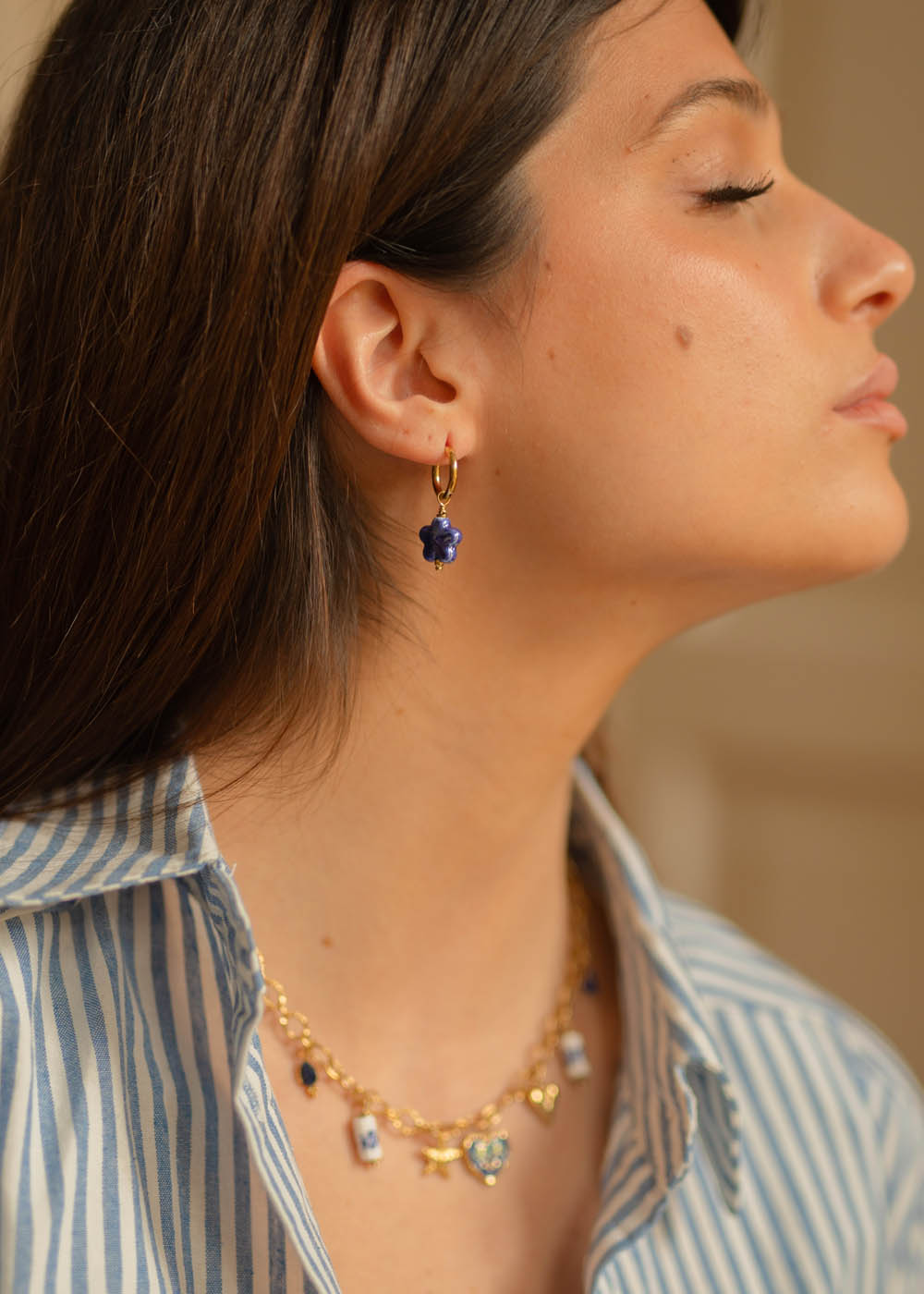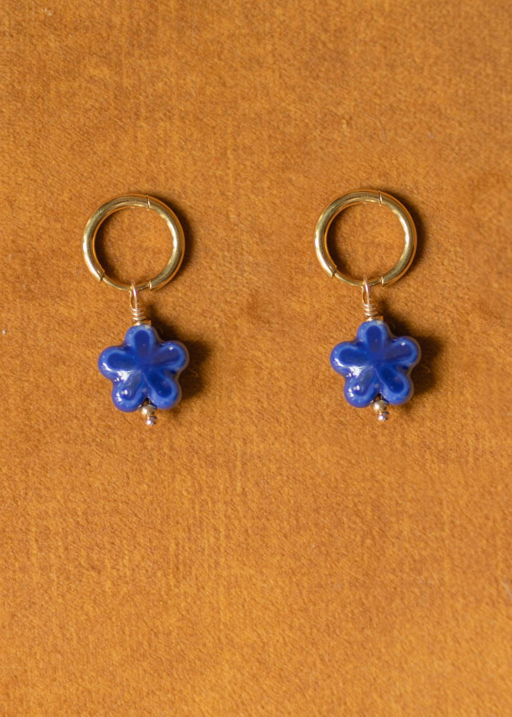 Il piccolo cerchio in acciaio rodiato sostiene un charm a forma di fiore, dalle linee morbide e dal raffinato tono blu, che dona luminosità con discrezione.