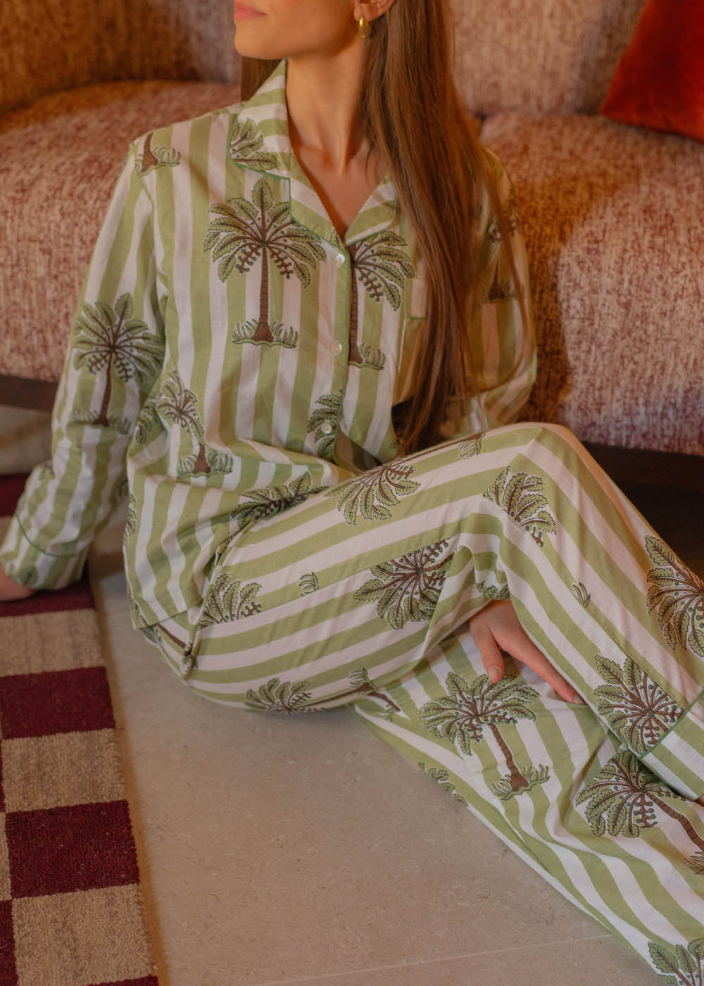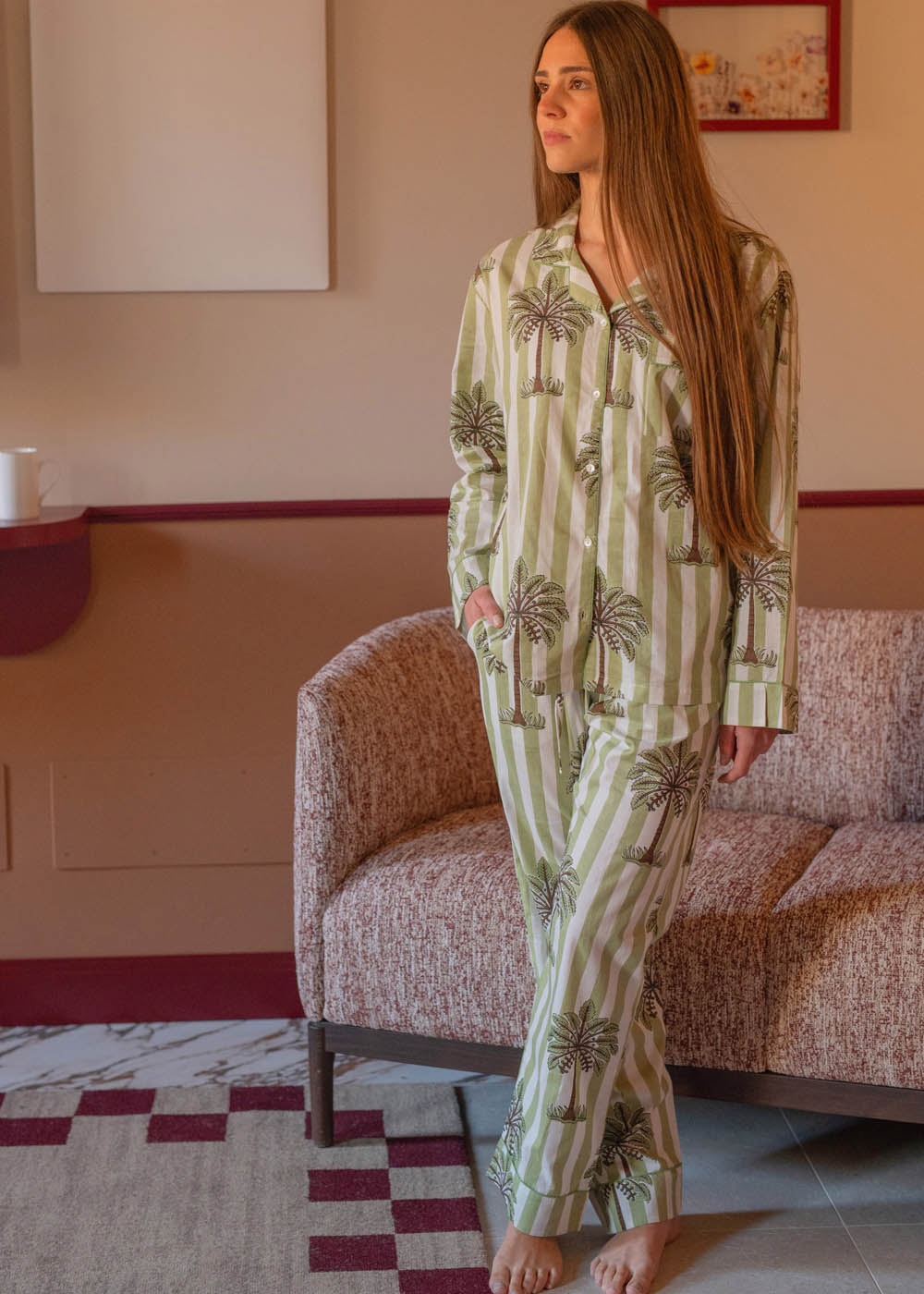 Una stampa fresca e raffinata, perfetta per un pigiama in cotone pensato per chi desidera avvolgersi in un comfort dolce e in uno stile essenziale ma ricercato.