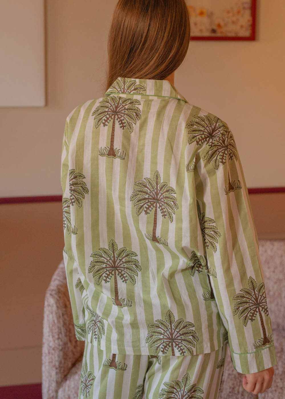 Il pigiama Venere grazie alla fantasia a righe in verde salvia e bianco evoca brezze leggere e paesaggi sereni.
